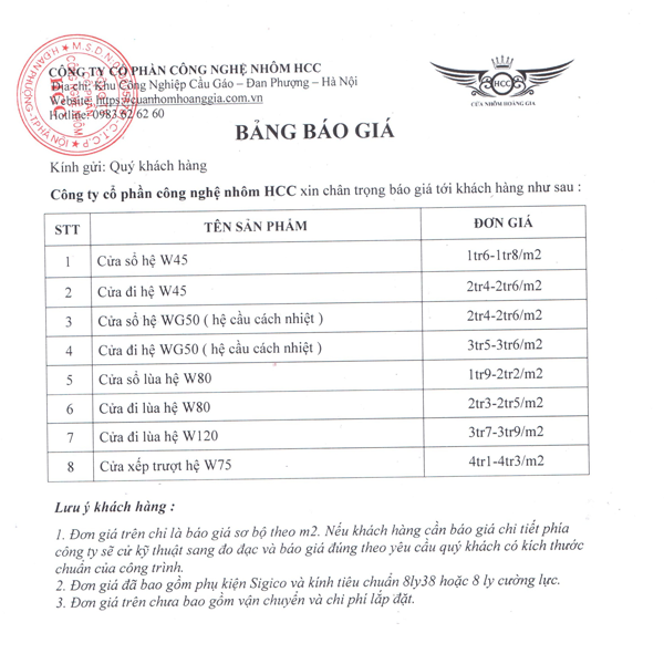 - Khách hàng có thể tham khảo bảng báo giá sơ bộ cửa nhôm kính cao cấp dưới đây: