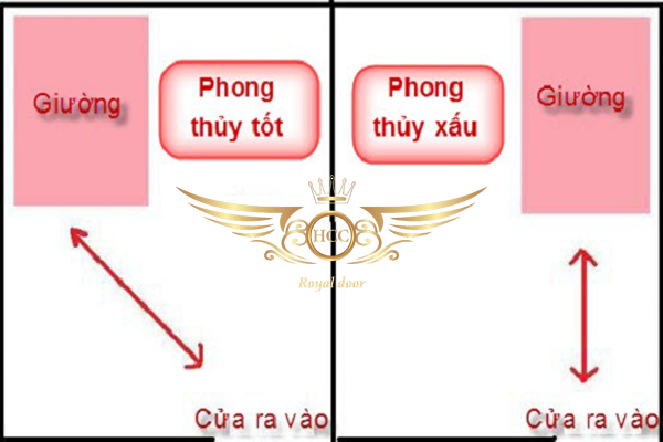 - Trong phòng ngủ, giường ngủ chính là trung tâm phong thủy, nếu đặt giường ngủ sai vị trí hoặc không phù hợp sẽ gây ảnh hưởng tới sức khỏe và tài vận của gia chủ. Điều cấm kỵ tuyệt đối khi bố trí giường ngủ là không được đặt giường ngủ đối diện với cửa ra vào phòng ngủ vì dễ gây đau đầu, ảnh hưởng đến thần kinh, các bệnh về dạ dày, khoang bụng,…