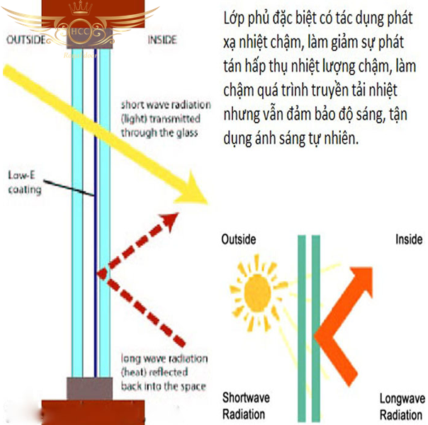 - Kính tiết kiệm năng lượng E-lower được sản xuất bằng cách phủ một lớp phủ siêu mềm trong môi trường chân không, dòng kính Low-E có khả năng hạn chế được